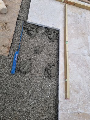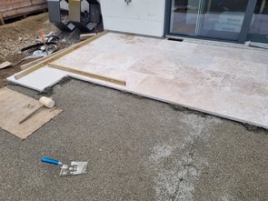 Die Jungs haben heute die Terrasse belegt. Ich war erst erschrocken, dass sie die Platten unten vollflächig mit Natursteinkleber beschmiert haben. Aber dann kam die Lösung: das brauchen sie, damit die Punktklebung zwischen Einkornbeton und Stein hält. Die haben etliche Säcke von den beiden Klebern verbraten. Sauteures Zeug. Aber wasserdurchlässig.