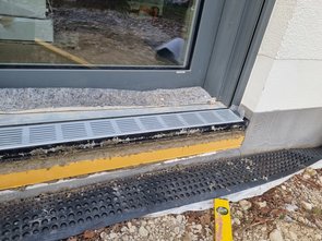 Am Nachmittag dann Styrodurstücke zugeschnitten und eingepasst. Bissl Betonestrich drunter und reichlich drauf. Rinne ging gut zuzuschneiden und mit einem Spezialkleber sicherheitshalber auch verklebt. Rinne dann aufgeklebt, unten noch bissl mit Beton aufgefüllt und einen kleinen Ablauf für die Rinne gelegt, dass das (wenige) Wasser versickern kann.