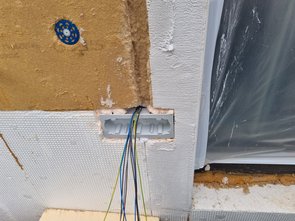 Nach "Dach zerschnitten" und "Fußbodenaufbau fertig" ein weiteres Gefühlshighlight: Mit vereinten Kräften das Problemkabel (als Einzeldrähte) eingezogen. Und auch gleich meinen Fehler mit der vergessenen Terrrassenleuchte ausgeglichen :-) 10 Drähte* mit dem frisch reparierten Durchzugskabel durchgebracht. Erstmal ging das Durchzugskabel schon mal nicht durch... Mit Gleitgel gings dann. Auch die 10 Drähte gingen im ersten Versuch ned durch (12 cm vor Ziel hängen geblieben). Mit Gleitgel und perfekt synchroner Schiebe- und Ziehleistung gings dann aber :-) Da es morgen regnen soll, dann gleich noch die gedämmte Steckdosenhalterung reingearbeitet. Ganz schön mühsam, mit den ganzen Einzelteilen und verschiedenen Dämmstücken. Hab am Ende dann bissl Ausschäumen müssen. Ein Styroporstückerl war verschwunden und die Dämmdicke war ned ganz kompatibel mit den vorgefrästen Ringen. Und ich musste ja improvisieren, weil ich nach oben noch die Drähte für die Leuchte ableiten musste.