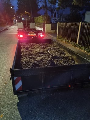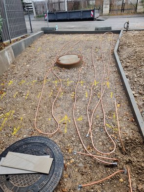 Dafür hat was anderes geklappt und mir einen gigantischen Stress morgen genommen: ich hab ALLE Rampenheizungsrohre gelegt, gebogen und geschnitten. Mehr als eine Stelle problematisch gewesen. Im Großen und Ganzen aber dann doch gut gegangen. Hat leider mehrfach richtig geschüttet. Ich war trotz Funktionskleidung von innen und außen nass. Hab die Rohre dann alle in die Rampe rein. Hoffentlich kriege ich sie morgen ohne Beschädigung dann wieder raus, wenn die Tragschicht asphaltiert ist.