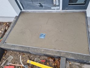 Kamen und haben Podest mit Kies aufgefüllt und verdichtet und angefangen zu betonieren. Gut, dass ich die ganze Zeit da war und die Maße vorgeben/kontrollieren konnte. Die Feinarbeit (gefühlt 2 h) habe ich dann gemacht und eine glatte Ebene für den Fußabstreifer hergestellt. Der Ablauf sitzt jetzt fast einen Zentimeter tiefer, aber wohl sinnvoll so.