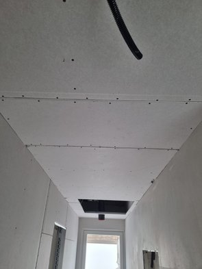 Bevor die Trockenbauer die Flurdecke geschlossen haben, schnell noch die bissl unsaubere Stelle an der Dachdämmung mit Spezialsilikon ausgespritzt und dann noch mit dem Steico-Teufelsklebeband verschlossen. Das sollt jetzt die Blower Door-Test nicht mehr behindern! Wahrscheinlich wars vorher eh schon dicht, aber sicher ist sicher und außer ein paar Euro Kleber hats nix gekostet, Klebeband war eh der Rest noch übrig.