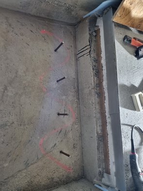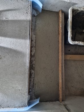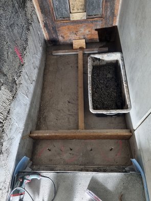 Nachdem mir die Schleusenstufe unangenehm hoch war (und alle anderen Stufen im Keller so flach sind), haben wir letzte Woche mit Architekt gesprochen, dass wir noch eine Stufe betonieren. Also vier Eisen (es war der letzte Eisenrest!!!) in den Boden gebohrt und reingeschlagen. Dann kleine, ziemlich improvisierte, Schalung gebaut und gemessen. Dann den sauschweren Sack angerührt und eingebaut. Überraschung: die Stufe war grad mal zu 50% fertig. Wie konnte das sein, ich hatte doch 40 Liter ausgerechnet. Ich Depp hab Liter und kg vertauscht... Also zweiten Sack angerührt, hat dann genau gereicht und ganz kleiner Rest geblieben.