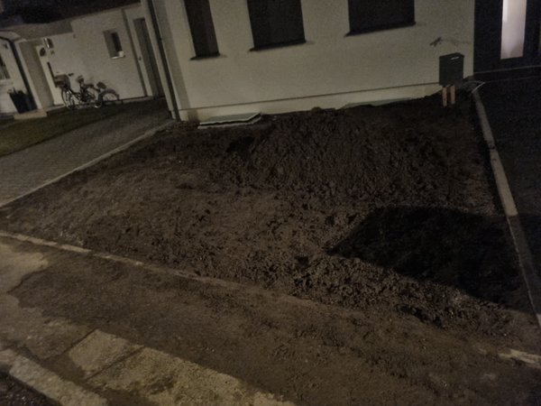 Spedition hat heute angerufen, es kommen sogar neun Paletten Steine, Wahnsinn :-( Also am Abend noch den restlichen Haufen eine Stunde lang weggeschaufelt. Mit Schubkarre ins kleine Beet ging schon nix mehr, daher einfach nur nach hinten geschaufelt.