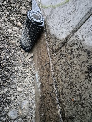 Lichtgraben noch die Löcher geschaufelt und den Rand freigeschaufelt, dass ich noch Noppenbahn einbringen konnte (glaub zwar ned, dass es nötig ist, aber ich hatte noch Reste). Mein Hang zum Perfektionismus hat die Sache dann leider verzögert, weil ich unbedingt die überstehenden Betonausflüsse wegschlagen wollte. War zum Glück zügig erledigt und jetzt ist alles glatt und die Noppenbahn liegt perfekt an.