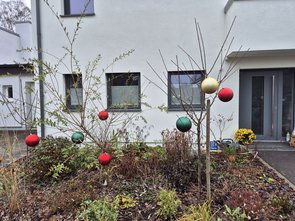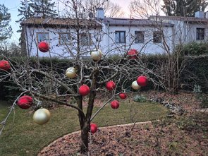 Adventswochenende: ich darf ab jetzt Stollen essen und Weihnachtsdeko raus. Apfelbaum hat paar Kugeln mehr bekommen und im Vorgarten gibts jetzt auch paar Kugeln. Muschelzypresse hat jetzt die kleine Solar-LED-Lichterkette bekommen, die für den Weihnachtsbaum im Garten zu klein geworden ist. Jetzt müsst ich nur die neu gekaufte für den Weihnachtsbaum finden.