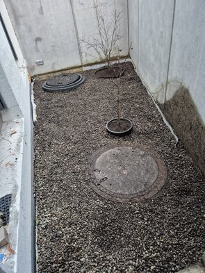 Ahorn eingepflanzt. Mama hatte die Idee, sdas abgeschnitte Oberteil vom Stromschacht als Umrandung zu verwenden. Schaut gut und müsste eigentlich auch gut halten, da UV-stabil.