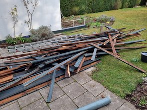 Deutlich anstrengender (Latten noch länger als links) gewesen. Ständig Leiter hoch und runter. Hält fit. Im Ergebnis ganz schön viel Holz zusammengekommen.