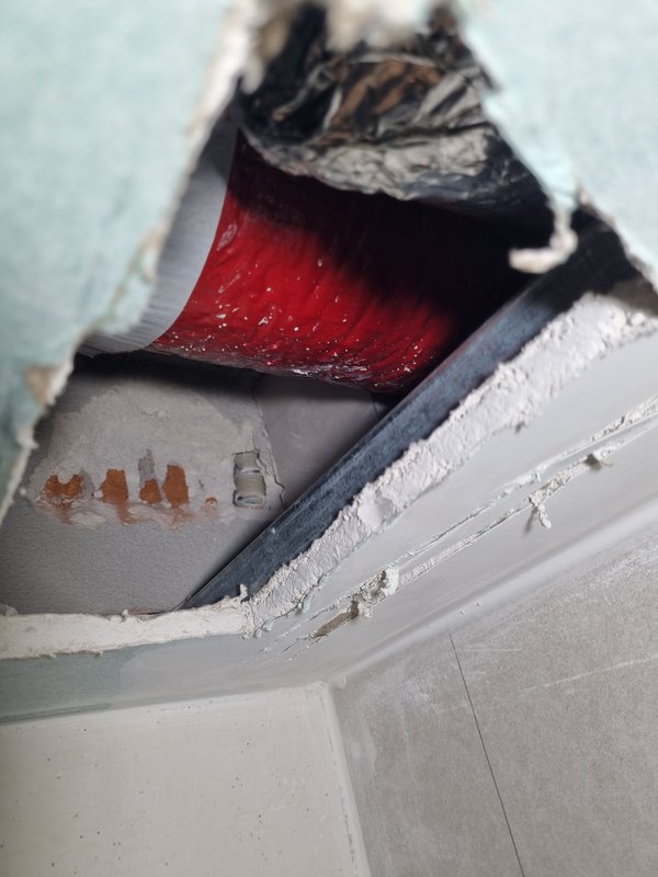 Zum Glück noch nicht gemalert: ich musste im Fitnessraum die Trockenbaudecke nochmal öffnen (weiß ja, dass sowas wieder leicht zu verschließen ist), damit ich den Verrohrungsfehler lösen kann und die KNX-Leitung für den Neubau angeschlossen werden kann. Morgen oder Montag dann Kabel einziehen. Wird dann noch schönes Gefummel!