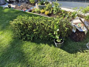 Loch 1 wieder zugeschaufelt und Eibe wieder eingesetzt (krass, wie viel schwerer die in zwei Jahren geworden sind!). Jetzt hält der Pfosten der Holzwand wieder sicher. Das Loch war nämlich auch drunter.