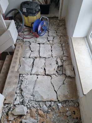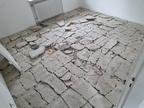 Dann das bekannte Spiel: Teppich raus, Estrich perforieren - nach einem anstrengenden Vortag (und ganzer Woche) wird die Hilti ganz schön schwer - vor allem, wenn sie im Estrich hakt und man sie rausziehen muss.