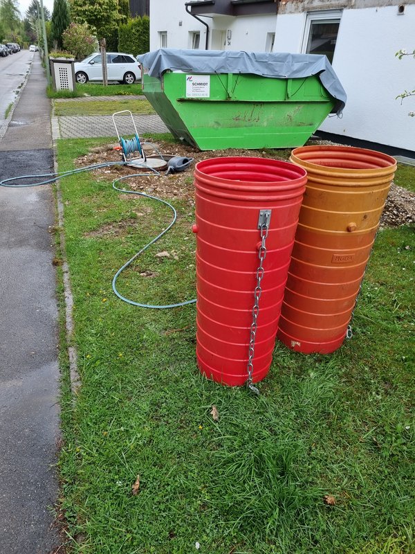 Bauschuttrutschen für die Rückgabe am Montag Früh sauber gemacht. Gut, dass der Anschluss am Bauwasserhahn zum Gardena-System passt und ich den Schlauchwagen anschließen konnte.