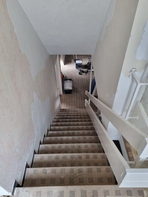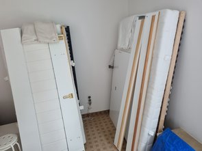 Nachdem die beiden Betten trotz Schnäppchenpreis immer noch nicht verkauft sind, erstmal die Treppe von den abgespachtelten Farbstücken befreit und dann Betten zerlegt und ins Wohnzimmer umgelagert.
